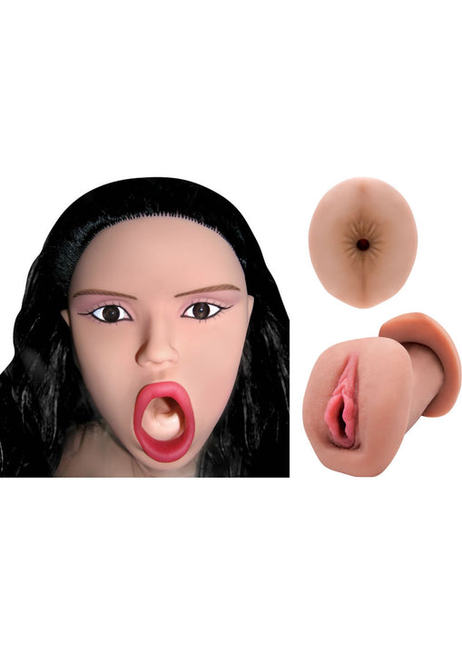 Life-size inflatable love doll with removable CyberSkin pussy and ass. Open ended, ribbed love tunnel. Realistic, 3D face with soft lips and a deep throat mouth. Lifelike eyes and extra long hair. Perky breasts with soft, erect nipples. Waterproof. Phthalate free. CyberSkin made in USA. Includes a repair kit.